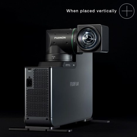 פוגיפילם פיתחה מקרן על יחודי שעושה שימוש בעדשת הקרנה על ציר מתהפך , שנותן את היכולת לכוון את העדשה למעלה, למטה, קדימה, אחורה, שמאלה וימינה כדי להקרין תמונות בכיוונים שונים מבלי להזיז את היחידה הראשית. משמעות הדבר היא שניתן להקרין תמונות לא רק על קיר או על מסך אלא גם על התקרה ועל הרצפה, ולעבור בקלות בין תצוגה אנכית לאופקית.